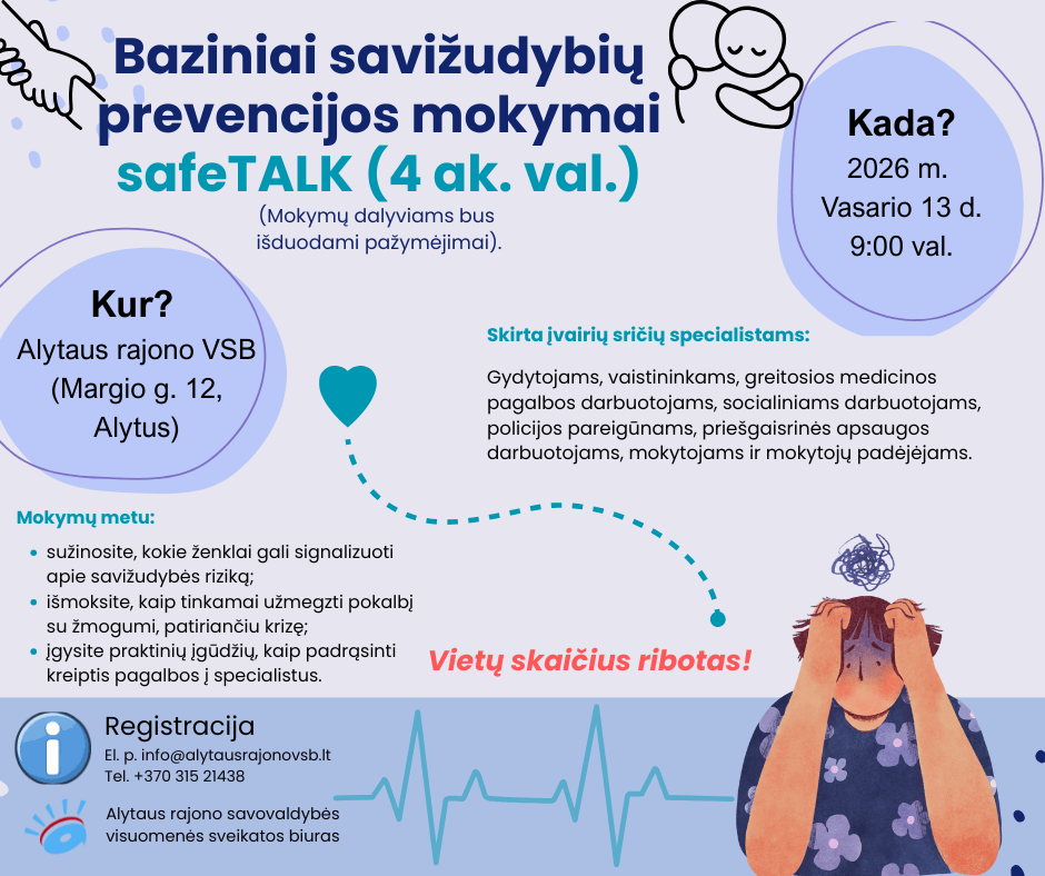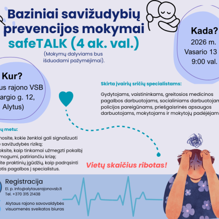 Kviečiame Alytaus rajono specialistus dalyvauti nemokamuose savižudybių prevencijos mokymuose safeTALK, kuriuose išmoksite atpažinti savižudybės rizikos ženklus, drąsiai pradėti pokalbį šia jautria tema ir suteikti pagalbą tiems, kuriems jos labiausiai reikia.