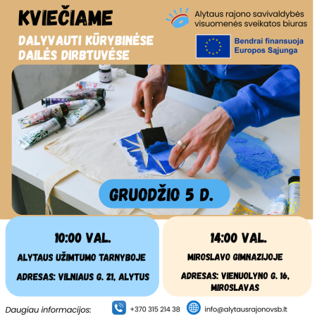 Alytaus rajono savivaldybės visuomenės sveikatos biuras, įgyvendindamas projektą „Visuomenės sveikatos paslaugų gerinimas Alytaus rajone“ Nr. 21-518-P-0001 kviečia visus norinčius prisijungti ir dalyvauti kūrybiniuose dailės užsiėmimuose!