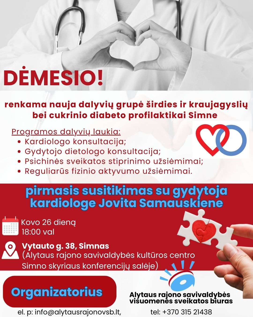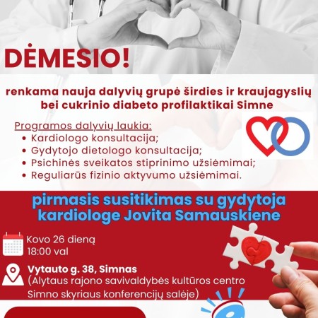 Kovo 26 d. 18:00 val. Alytaus rajono savivaldybės kultūros centro Simno skyriaus, konferencijų salėje, adresas Vytauto g. 38, Simno m., Alytaus r., vyks susitikimas su gydytoja kardiologe Jovita Samauskiene. Kviečiame dalyvauti!